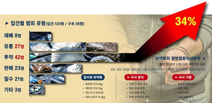 합수본은 지난 100일 동안 마약 밀수 유통 재배 등 공급 사범을 집중 수사했다. 그 결과 124명을 입건하고 56명을 구속했다.