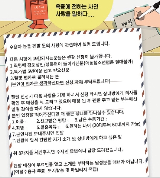 옥바라지 업체의 광고를 확인한 결과, 해당 펜팔 신청에는 제한이 있었다. 강도·살인, 성범죄, 또는 5년 이상의 중형을 선고받은 재소자는 신청할 수 없었다.