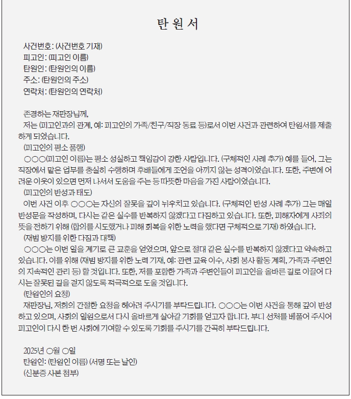 또한, 탄원인의 관계와 역할을 명확히 밝히고, 피고인을 어떻게 도울 것인지 구체적인 계획을 제시하는 것이 중요하다.