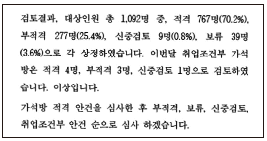 조건이 갖추어지면 예비심사를 거쳐 가석방심의위원회 본회의에 회부될 수 있습니다. 과거 가석방 심의위원으로 활동했던 분의 설명에 따르면, 표 1과 같이 가석방 심사 대상자 총 1,092명 전원을 심사하는 것이 아니라, 그중 ‘예외 인원’, ‘부적격’, ‘보류’, ‘신중 검토 대상자’만을 선별하여 심의한다고 합니다.