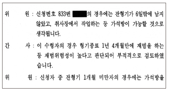 “석방 예비심사 기준은 재량 준칙에 불과하며, 이를 공개할 경우 수형자 및 가족의 오해를 초래하고, 가석방 심사 업무에 대한 불신을 유발할 수 있다.” 또한, “가석방 심사는 행정처분의 일종으로 일정 수준의 재량권이 필요하다.”고 설명한 바 있습니다.