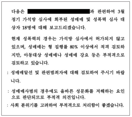교정기관 예비심사를 통과하거나 필요적 가석방 대상자로 본회의에 올라가더라도 표 3과 같이 법일괄 심사탈락 처리하고 있습니다. 만약 해당 방침이 바뀌었다면 법무부에서 공문이나 보도자료로 입장을 발표했을 것이나, 현재까지 그런 변화는 없는 상태입니다.
