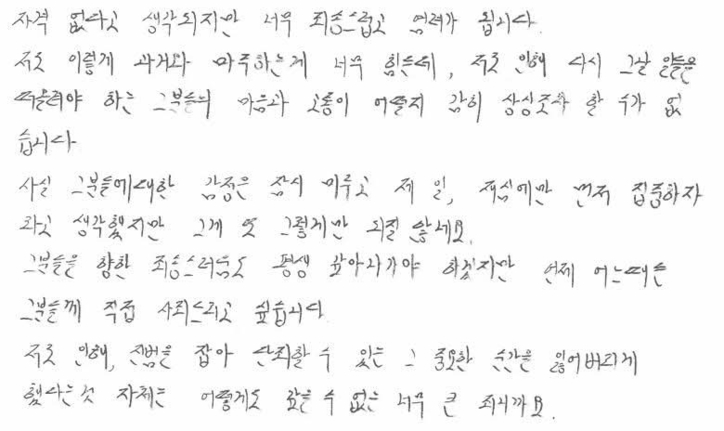 이씨는 최근 무죄를 주장하며 재심 청구를 준비하고 있다. 그는 옥중에서 써 내려간 편지에서 “저로 인해 다시 그날 일들을 떠올려야 하는 그분들의 마음과 고통이 어떨지 감히 상상조차 할 수 없다”며 “진범을 잡아 단죄할 수 있는 소중한 기회를 잃어버리게 한 것에 대해 사과하고 싶다”고 밝혔다.