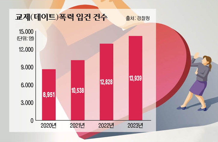 교제폭력은 해마다 증가세를 보이고 있다. 경찰청에 따르면 교제폭력 입건 건수는 2020년 8951건에서 2023년 1만3939건으로 3년간 56% 늘었다. 2024년 1~4월 신고 건수만 2만5967건으로, 하루 평균 214건에 달한다.