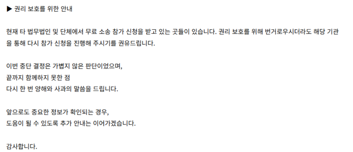 해당 공지에는 소송 중단의 구체적 사유는 물론, 이미 제출된 개인정보와 신분증 사본의 보관 여부와 파기 시점, 향후 처리 방안에 대한 설명은 포함되지 않았다.
