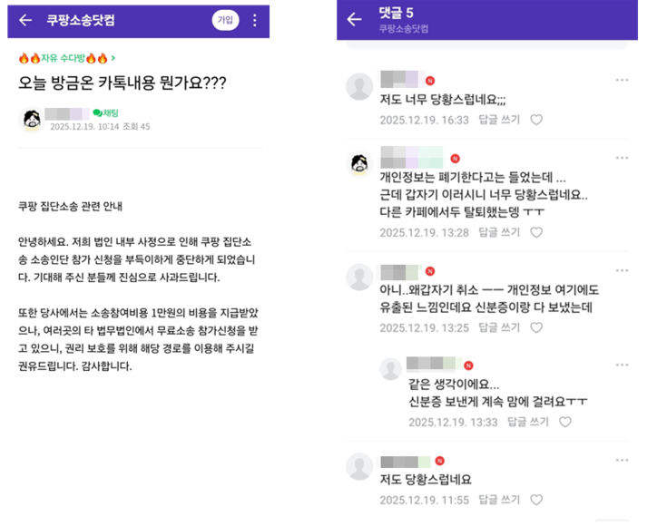 공지 이후 카페 회원들 사이에서는 불안이 빠르게 확산됐다. 이미 개인정보 유출 피해를 겪은 상황에서, 추가로 신분증 사본을 제출한 뒤 소송이 중단됐다는 점에서 개인정보 관리에 대한 우려가 잇따랐다. 일부 회원들은 “법률 대응을 믿고 개인정보를 넘겼는데 설명 없이 끝났다”, “소송보다 개인정보가 더 걱정된다”는 반응을 보였다.