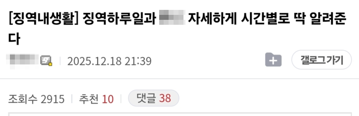 지난달 18일 디시인사이드의 한 교정 관련 갤러리에는 ‘징역 하루 일과 XX 자세하게 시간별로 딱 알려준다’는 제목의 게시글이 올라왔다. 해당 커뮤니티는 전·현직 교정직 준비생과 출소자, 수용 경험자들이 익명으로 교정시설 내부 생활을 공유하는 공간이다.