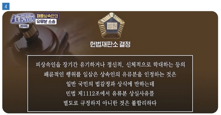 박변: 그 부분 때문에 헌법재판소에서 2024년도 유류분 상속에 대한 내용을 다루고 있는 민법 제1112조 일부 호에 대한 위헌 및 헌법불합치 결정을 내리는 일이 있었습니다. 그간 민법은 유류분 상실 사유를 별도로 규정하지 않았는데, 피상속인을 장기간 유기하거나 신체적·정신적으로 학대한 상속인까지 일률적으로 유류분을 인정하는 것은 문제가 있다는 취지였습니다.