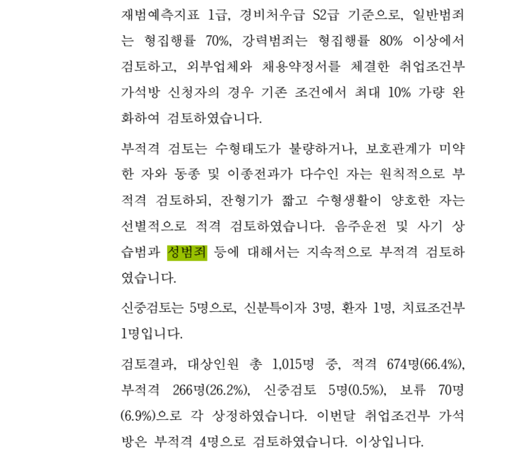 심사 과정에서는 특정 범죄 유형에 대해 엄격한 기준이 유지됐다. 수형 태도가 불량한 경우 보호관계가 미약한 경우 동종 또는 이종 전과가 많은 상습범은 원칙적으로 부적격 의견이 제시됐다. 음주운전 상습범과 사기 상습범도 엄격한 기준이 적용됐다.