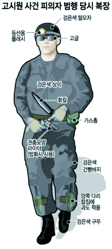 등산용 랜턴을 부착한 검은 털모자, 검은색 고글, 검은색 상의와 과도 2개를 넣어둔 검은색 건빵바지를 착용한 상태였다.