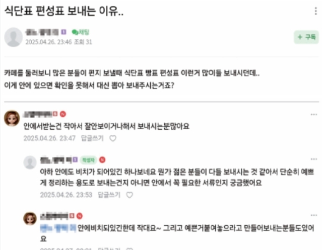 글쓴이는 카페를 둘러보던 중, 많은 이들이 편지에 식단표나 편성표를 함께 보내는 모습을 보고 궁금증이 생겼다고 했다.
