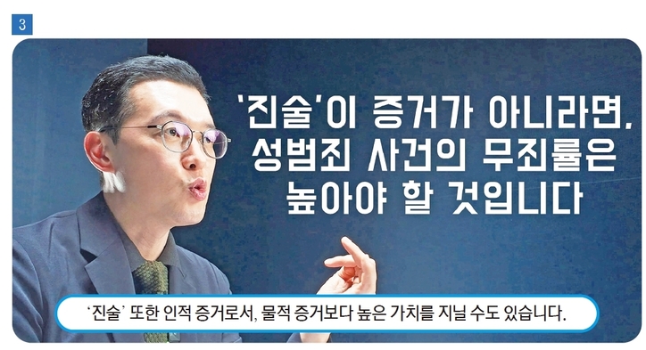 곽변: 이러한 점은 성범죄 사건에서 자주 확인됩니다. 사건의 특성상 물적 증거가 부족한 경우가 많고, 당사자 진술이 핵심 증거가 되는 경우가 적지 않습니다. 만약 진술이 증거로 인정되지 않는다면 이러한 사건은 모두 무죄가 되어야 하겠지만, 실제 재판에서는 진술의 신빙성을 중심으로 유무죄가 판단됩니다. 이는 특정 범죄에 한정된 것이 아니라 모든 형사사건에 공통적으로 적용되는 원칙입니다.