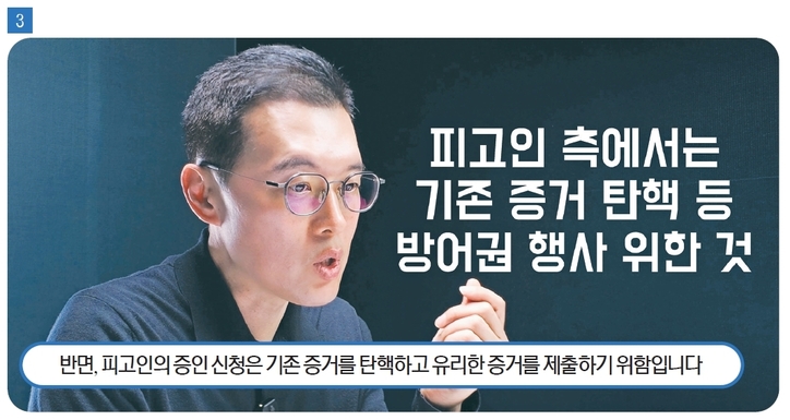 곽변: 반면 피고인 측의 증인 신청은 성격이 다소 다릅니다. 이미 제출된 증거를 탄핵하거나, 새로운 사실관계를 드러내기 위한 목적이 중심이 됩니다. 예를 들어 특정 행위의 존재 여부가 쟁점이 되는 사건에서는 당시 상황을 목격한 사람을 증인으로 신청해 사실관계를 다투는 방식이 사용됩니다. 이는 형사 재판에서 보장된 방어권의 일환으로 볼 수 있습니다.