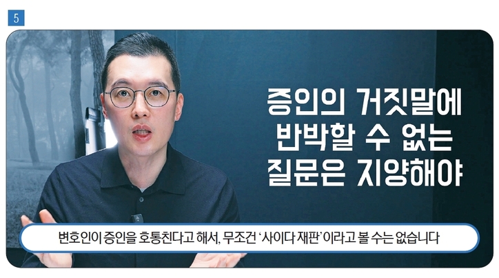 곽변: 증인신문 과정에서 특히 주의할 점은, 반박이 어려운 진술을 반복적으로 확인하는 방식입니다. 증인이 기존 진술을 그대로 유지하는 상황에서 이를 단순히 재확인하는 질문이 이어질 경우, 결과적으로 불리한 진술이 법정에서 강화되는 효과가 발생할 수 있습니다. 따라서 증인신문에서는 질문의 내용뿐 아니라, 그 질문 이후 어떤 방식으로 사실관계를 검증할 수 있는지도 함께 고려될 필요가 있습니다.
