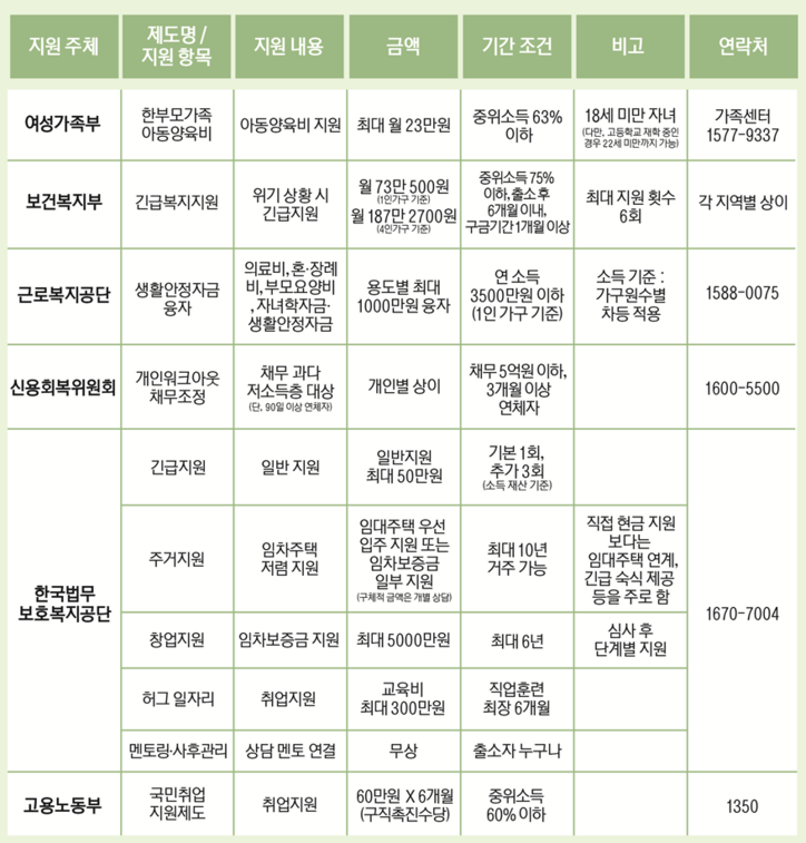 보건복지부가 운영하는 ‘긴급복지 생계지원’ 제도는 주소득자의 사망·실직·질병 등으로 생계 유지가 곤란한 위기 가구를 대상으로 한다. 보건복지부 장관이 고시한 ‘그 밖의 위기 사유’에는 교정시설 출소 후 생계가 곤란한 경우도 포함된다.