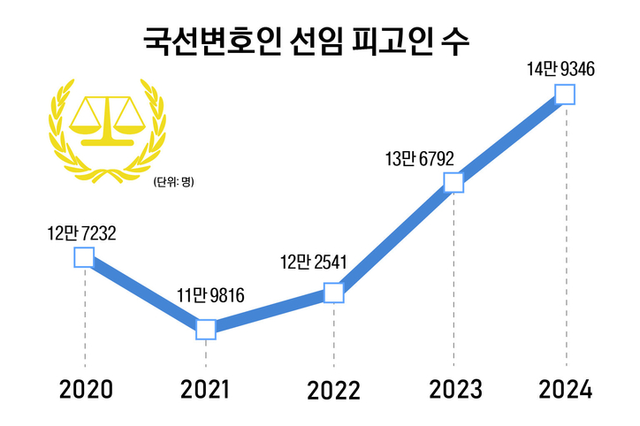 실제로 국선변호 수요는 2021년 감소 이후 증가세로 전환됐다. 2025 사법연감에 따르면 최근 5년간 국선변호인을 선임한 피고인 수는 2020년 12만 7232명, 2021년 11만 9816명, 2022년 12만 2541명, 2023년 13만 6792명, 2024년 14만 9346명으로 집계됐다.