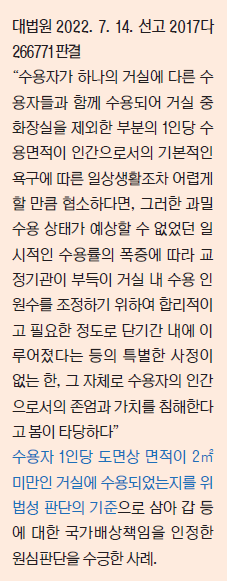 헌법재판소는 2016년(헌법재판소 2016. 12. 29. 2013헌마142 전원합의체 결정) 수용자 1인당 1.06㎡, 1.27㎡의 수용 면적은 신체적·정신적 건강이 악화되거나 인격체로서의 기본 활동에 필요한 조건을 박탈당하는 등 인간으로서 최소한의 품위를 유지할 수 없을 정도로 과밀한 공간에서 이루어진 수용 행위로, 인간의 존엄과 가치를 침해하여 위법하다고 판시하였습니다.