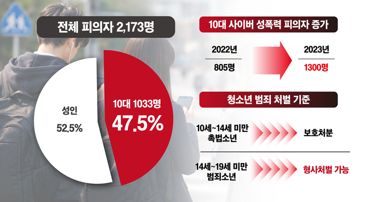 청소년 피의자는 최근 몇 년 사이 빠르게 증가하고 있다. 2022년 805명이던 10대 사이버 성폭력 피의자는 지난해 1300명으로 늘어 약 56% 증가했다.