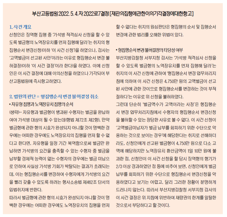 본 사건의 경우 형집행순서 변경신청을 통해 검찰이 재량권을 행사하여 형집행순서를 변경해 줄 것을 촉구할 수는 있습니다. 하지만 형집행순서가 변경되지 않아 가석방에서 불이익을 받는다고 하더라도 이를 위법하다고 보기는 어렵습니다.
