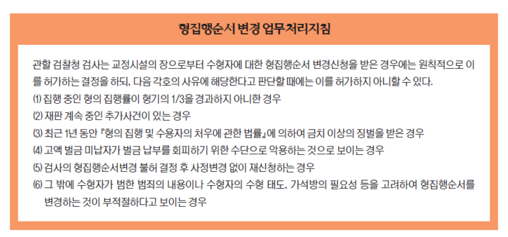 그렇지만 수형자는 형집행순서 변경을 신청할 권리가 없다는 것이 판례의 일관된 태도입니다. 그럼에도 불구하고 수형자는 형집행순서 변경신청서를 제출할 수 있는데, 이는 자신의 정당한 권리를 행사하는 것이 아니라, 단지 검사의 직권발동을 촉구하는 것입니다.