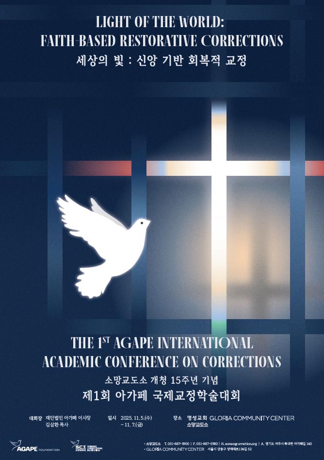 5일 (재)아가페 소망교도소는 이날부터 7일까지 서울 강동구 글로리아 커뮤니티센터와 경기도 여주 소망교도소에서 ‘세상의 빛: 신앙 기반 회복적 교정’을 주제로 ‘제1회 아가페 국제교정학술대회’를 개최한다고 밝혔다.