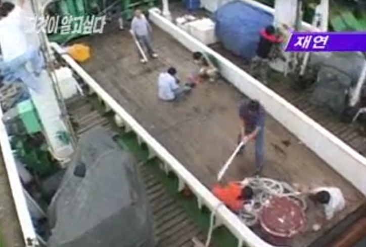 다음날, 배는 조업 지역에 도착해 선원들은 일을 시작했다. 외국인 선원들은 여전히 조업이 미숙했고 이에 불만을 가진 선장이 쇠파이프로 조선족 한 명을 폭행했다. 해당 조선족은 폭행을 당하자 선장의 얼굴을 손으로 가격한 뒤 참치 처리용 칼을 집어들고 위협하기 시작했다.