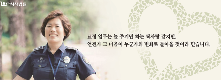 A. 교정 업무는 늘 많이 주지만 그만큼 돌려받는 경우는 매우 드뭅니다. 수용자들에게 아무리 도움을 주고 조언을 해도 다시 원래의 생활로 돌아오거나 같은 실수를 반복하곤 하죠. 이런 경험이 쌓이다 보니 제 역할이 마치 일방적으로 주기만 하는 ‘짝사랑’처럼 느껴졌습니다. 그래도 언젠가는 변화의 씨앗이 싹터서 서로 마음을 나누게 되는 순간이 오지 않을까요? (웃음)