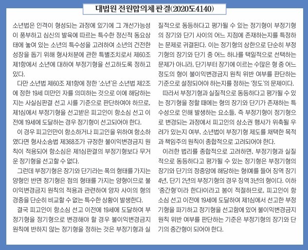 1심에서 단기형을 선고받은 피고인은 단기 형량을 모두 복역하면 출소할 수 있는 가능성이 있었는데 상소심 재판 도중 성인이 되었다는 우연한 사정으로 단기 형량 이상의 형량 복역을 강제한다면 실질적으로 불이익하게 변경되었다는 이유에서입니다. 하지만 2020년에 이러한 대법원의 판례 법리가 전원합의체 판결(대법원 2020. 10. 22. 선고 2020도4140호 전원합의체 판결)로 변경이 되었습니다.