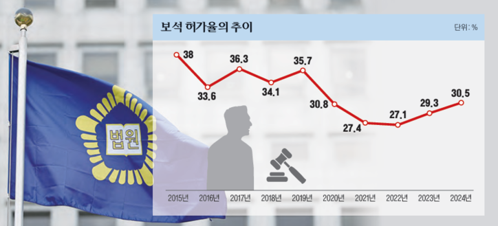 보석 허가율이 최근 3년간 30%대에 머물며 피고인의 방어권을 실질적으로 보장하기 위한 제도의 취지가 약화되고 있다는 지적이 제기되고 있다. 법원 간 허가율 편차도 커지면서 “보석은 결국 법관 재량에 좌우된다”는 지적이 제기되고 있다.