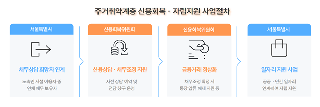 신복위는 매주 목요일 오후 3시부터 4시까지 서울중앙·관악서민금융통합지원센터에 주거취약계층 전용 상담창구를 운영해 개인별 상황에 맞는 채무조정 제도를 안내하고, 서민금융 상품 및 복지제도 연계 상담을 제공한다. 또한 공공일자리 참여자에게도 신용회복 상담을 지원해 경제적 자립을 돕기로 했다.