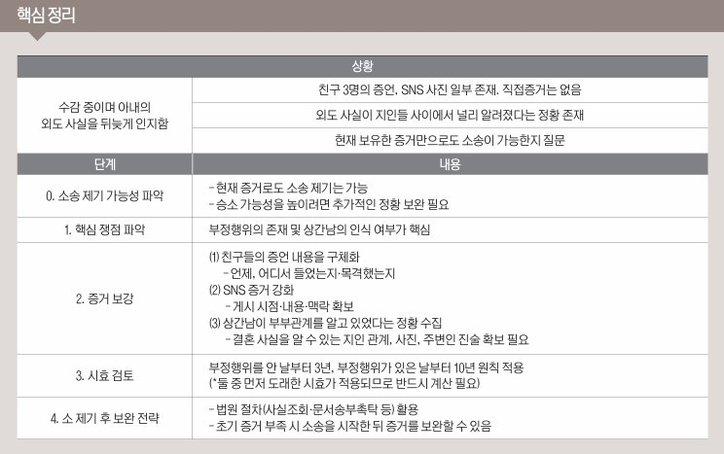 지금 말씀하신 증거들(친구들의 일 관된 증언, SNS 캡처, 주변 지인들 대 부분이 외도 사실을 알고 있다는 사정, 당사자들이 서로 알고 지내는 사이였다는 점)은 모두 부정행위를 추단할 수 있는 유력한 정황증거가 됩 니다.