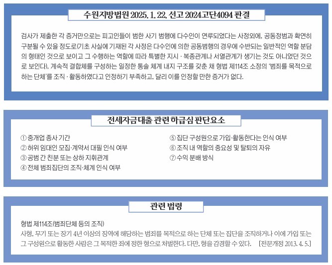 전세자금 대출과 관련된 구체적인 사건에서 하급심 법원은 1) 중개업을 했던 기간, 2) 허위 임대인을 모집 한다거나 임대차 계약서를 대필한다는 점을 알고 있었는지 여부, 3) 공범들 간의 친분관계 또는 상하 지휘관계, 4) 전체적인 범죄 집단 조직의 구성원, 조직체계를 알고 있었는지, 5) 피고인이 이와 같은 집단의 구성원으로 가입하여 활동한다는 인식이 있었는지, 6) 조직 내에서 피고인의 활동의 중요성, 탈퇴의 자유, 7) 수익분배 방식 등을 종합적으로 고려하여 무죄를 선고한 사례가 존재합니다(인천지 방법원 부천지원 2023. 12. 13. 선고 2023고단1978호 사건 등).