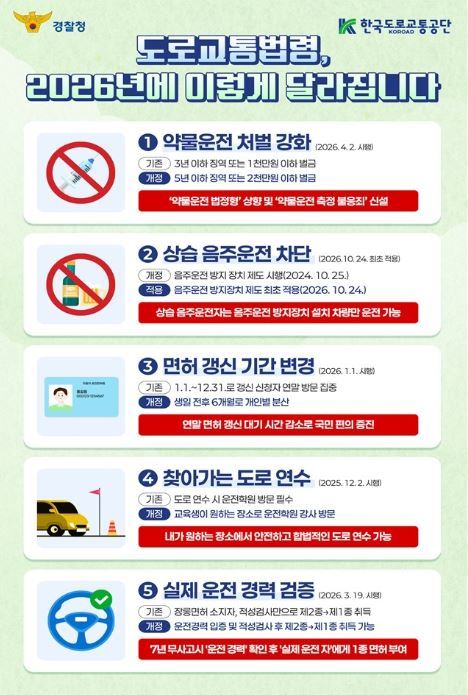 28일 경찰청이 공개한 ‘2026년 달라지는 도로교통법령’에 따르면 해 음주운전으로 면허가 취소된 뒤 2년의 결격 기간이 지난 상습 음주운전자가 다시 면허를 취득할 경우, 음주운전 방지장치를 차량에 부착해야 한다.
