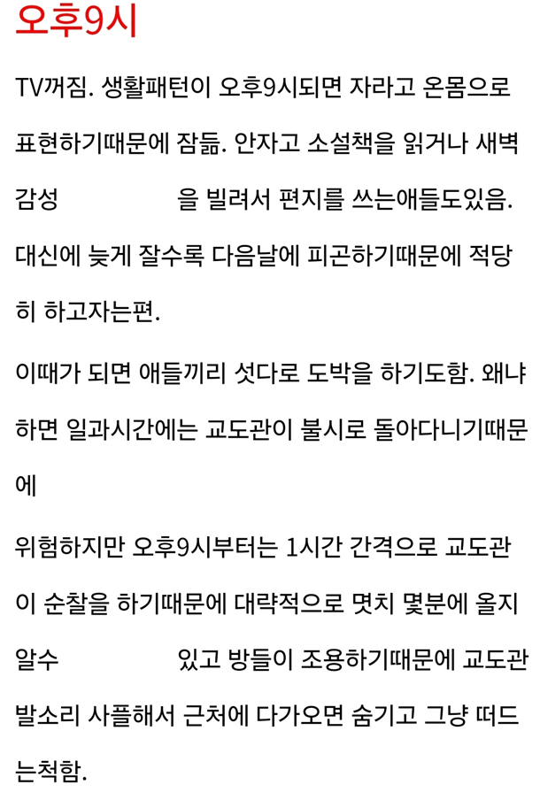 문제는 야간 시간대다. 그는 “야간이 되면 수용자들끼리 섯다를 치는 등 도박이 벌어지기도 한다”며 “일과 시간에는 교도관이 불시에 돌아다녀 위험하지만 오후 9시 이후에는 1시간 간격으로 순찰이 이뤄져 대략 몇 시 몇 분쯤 오는지 다 안다”고 전했다.