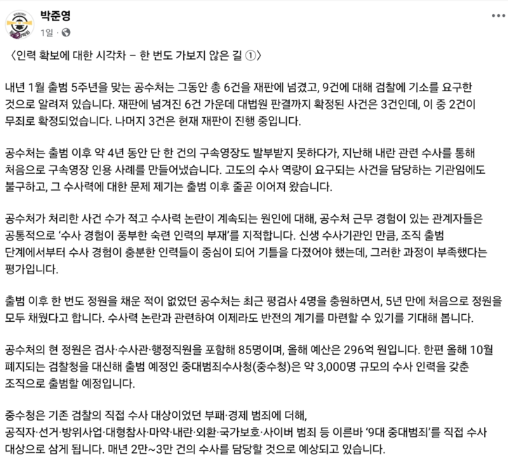 박 변호사는 공수처 출범 당시의 혼선을 언급하며, 신생 수사기관이 충분한 숙련 인력을 확보하지 못할 경우 구조적 문제가 반복될 수 있다고 경고했다.