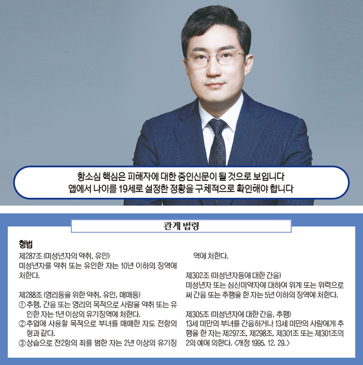 피해자는 성인만 이용할 수 있는 만남 앱에서 본인의 나이를 19세로 설정해 활동했고, 그에 따라 저는 상대방을 ‘연령을 19세로 설정해 둔 성인’으로 인식하고 만남을 가졌습니다.