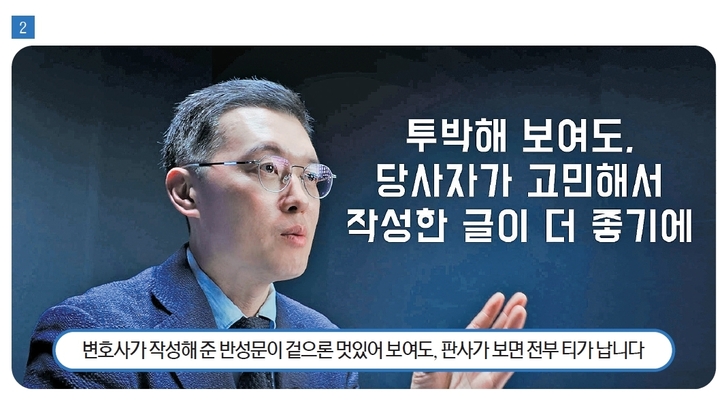 곽변: 그렇다면 반성문은 어떻게 써야 할까요? 따로 가이드를 드리지 않아도 먼저 쓰신 다음 봐달라는 분도 있지만, 글 쓰는 것에 부담을 느끼는 분도 참 많습니다. 저희는 충분히 도움을 드리되 대신 써드리는 건 지양하고 있습니다. 왜냐면 아무리 감추려 해도 변호사가 써준 건 티가 나기 때문입니다. 반성문의 뜻이 뭡니까. ‘피고인이 반성하는 마음을 담은 글’인데, 변호사가 써주면 진정성이 전혀 안 보이는 거죠. 변호사가 작성한 반성문이 겉으로 보기엔 멋있을지 몰라도, 반성문을 매일 보는 판사에게 그렇지 않습니다. 오히려 투박한 부분이 있어도, 피고인이 오랜 시간 고민해서 써 내려간 글이 훨씬 와닿습니다.