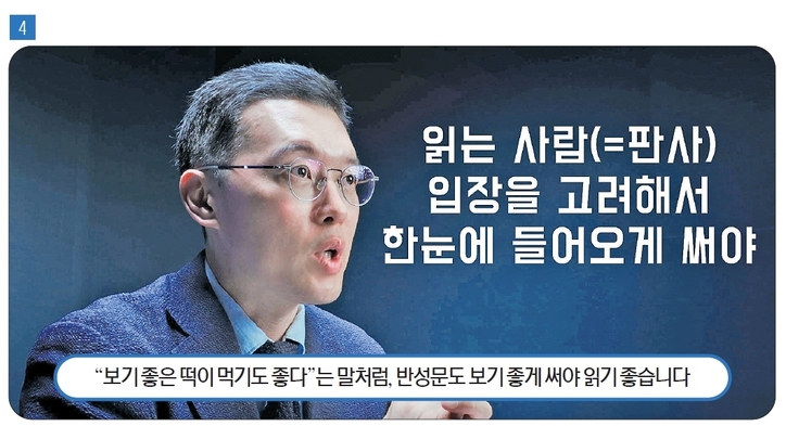 곽변: 그리고 ‘작성 양식’과 관련된 부분도 팁(TIP)을 드리겠습니다. 제가 항상 강조드리는 부분인데, 보기 좋은 글이어야 읽고 싶어집니다. 한눈에 들어와야 한다는 것이죠. 쓰실 때는 위쪽과 좌우로 여백을 두고 문단도 충분히 나눌 것을 권유드립니다. 글씨도 크게, 진하게 쓰시고요. 빽빽하거나 글씨가 작은 반성문은 판사님도 꼼꼼히 보기 어렵습니다. 판사님 입장을 생각해 보시기 바랍니다. 매일 수천 건의 문서를 읽느라 눈이 피로하실 것이고, 나이가 있는 판사님들은 노안도 있을 것입니다. 내 글을 한 번이라도 더 읽고 참작 해주길 바란다면, 적어도 읽기 좋게 쓰는 건 기본 중의 기본입니다.
