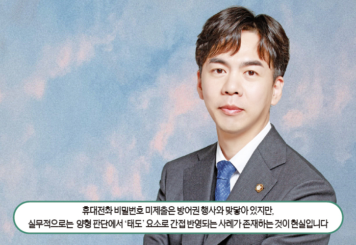 겉으로는 권리 행사라고 하면서도 양형 판단에서 ‘태도’ 요소로 간접 반영되는 사례가 존재하는 것이 현실입니다. 그리고 직접적으로 불리한 정상에 ‘수사기관에 휴대전화 비밀번호를 제공하지 않았다’라고 명시하는 경우들도 있습니다.