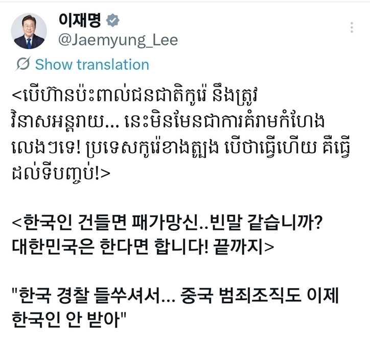 이 대통령은 30일 자신의 SNS를 통해 “대한민국은 한다면 합니다. 끝까지”라며 캄보디아 현지 중국 범죄조직이 한국 경찰 단속을 우려해 한국인 조직원을 모집하지 않는다는 내용의 기사를 소개했다.