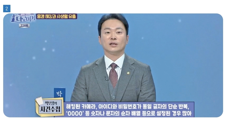 박변: 네, IP 카메라, 일명 홈캠은 자녀나 노인, 반려동물의 안전 상태를 살피거나 범죄를 예방할 목적으로 가정이나 사업장 등에서 널리 사용되고 있습니다. 인터넷망에 연결된 카메라를 실시간 송출하는 방식으로, CCTV보다 설치가 간단하지만 보안에는 더 취약한 단점이 있어 해킹 피해가 쉽게 발생하고 있습니다. 사용자들은 기능의 편의성, 가격의 합리성, 화질 등에 대한 관심만 있을 뿐 보안의 취약성에 대해서는 깊게 생각하지 못한 채 다양한 장소에서 사용하고 있습니다. 범죄자들은 이 점을 노리고 있는데요. 특히 해킹된 카메라의 경우 비밀번호가 단순 반복이나 맞히기 쉬운 패턴으로 되어있는 경우가 대부분이었습니다.