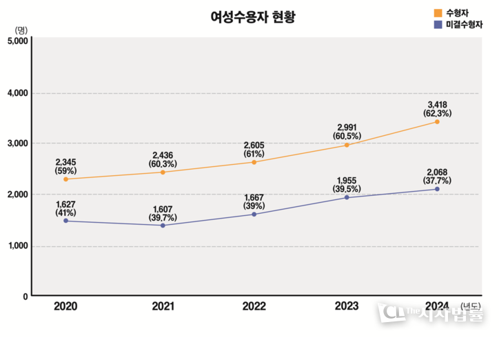 실제 ‘2025 교정통계연보’에 따르면 여성 기결수는 2020년 2345명에서 2024년 3418명으로 약 45.8% 증가했고, 미결수 역시 같은 기간 1627명에서 2068명으로 약 27.1% 늘었다.