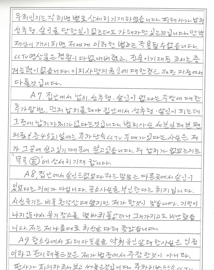 정씨는 성추행 및 약취유인 혐의와 관련해 국과수 감정이 없었고, 해당 혐의에 대해서는 무죄가 선고됐다는 점을 들며 “집 안에서의 성추행 살인은 없었다”고 주장했다. 이어 “당장이라도 재심을 청구하고 싶다”고 밝혔다.