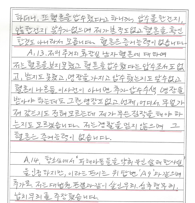 또 “압수수색 당시 현장에 참여하지 못했고 영장도 제시받지 못했다”며 “사건 당일 본드를 마셔 환각 상태였던 탓에 당시 상황을 정확히 기억하지 못한다”고 밝혔다.