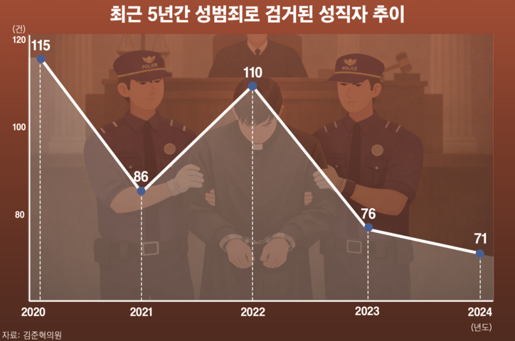 최근 5년간 성범죄 혐의로 경찰에 검거된 성직자가 400명을 넘는 것으로 나타났다. 상당수는 강간이나 강제추행 등 중대 성범죄에 해당하는 것으로 집계되면서 종교 지도자의 지위를 악용한 범죄에 대한 제도적 관리 필요성이 제기되고 있다.