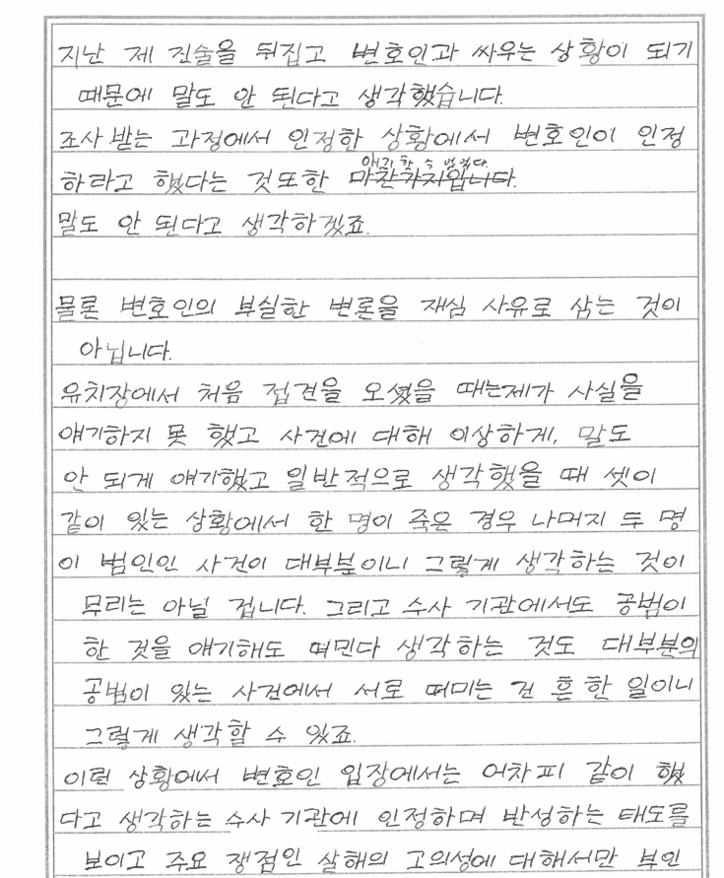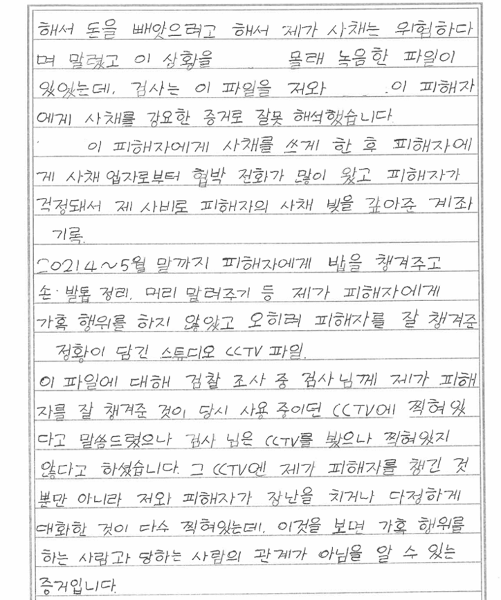 안씨는 편지 말미에서 “CCTV에 자신이 피해자를 챙기는 장면이 남아 있다”며 밥을 챙겨주거나 손톱을 깎아주는 영상이 재심 증거가 될 수 있는지 물었다.
