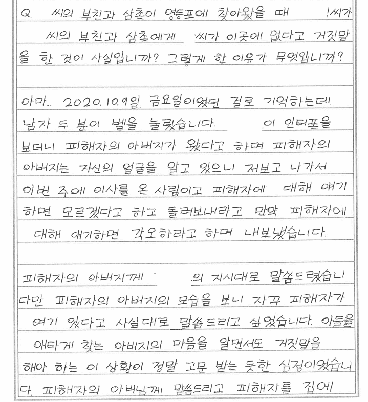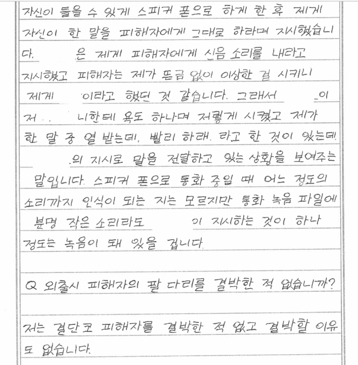 또 “피해자의 머리를 때리거나 목을 조른 핵심 폭행은 김씨가 저질렀다”며 “일부 시점에는 집을 비운 상태였다”고 주장했다. 안씨는 지하철 이용 기록과 카드 결제 기록 등을 통해 당시 현장에 없었다는 점을 입증할 수 있다고도 했다.