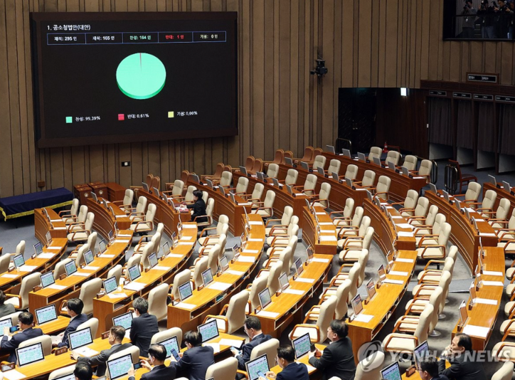 국회는 이날 본회의에서 공소청법을 재석 165명 중 찬성 164명, 반대 1명으로 가결했다. 개혁신당 천하람 의원이 반대표를 던졌다.