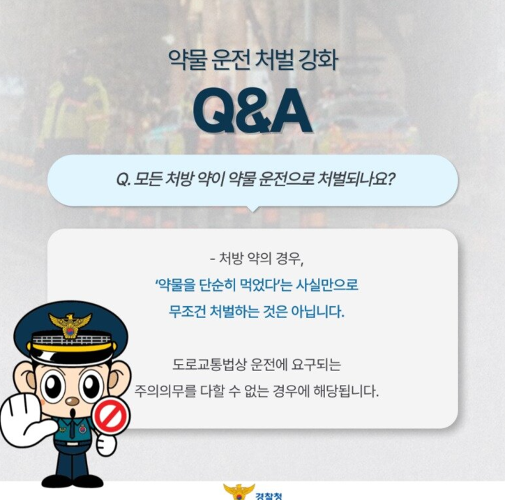 경찰청 관계자는 “단순히 약물이 검출됐다는 이유만으로 처벌하는 것이 아니라, 약물 영향으로 정상적인 운전이 어려운 경우에 한해 처벌하는 것”이라며 “복용 후 몸 상태에 이상이 있다면 운전을 하지 말자는 경각심을 높이기 위한 조치”라고 설명했다.