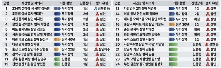 이들 가운데 상당수는 이미 무기징역이나 장기 징역형이 선고된 상태다. 24명 중 14명은 무기징역을 선고받았고 나머지도 징역 40년, 30년, 22년 등 중형이 내려졌다. 일부는 현재 재판이 진행 중이다.